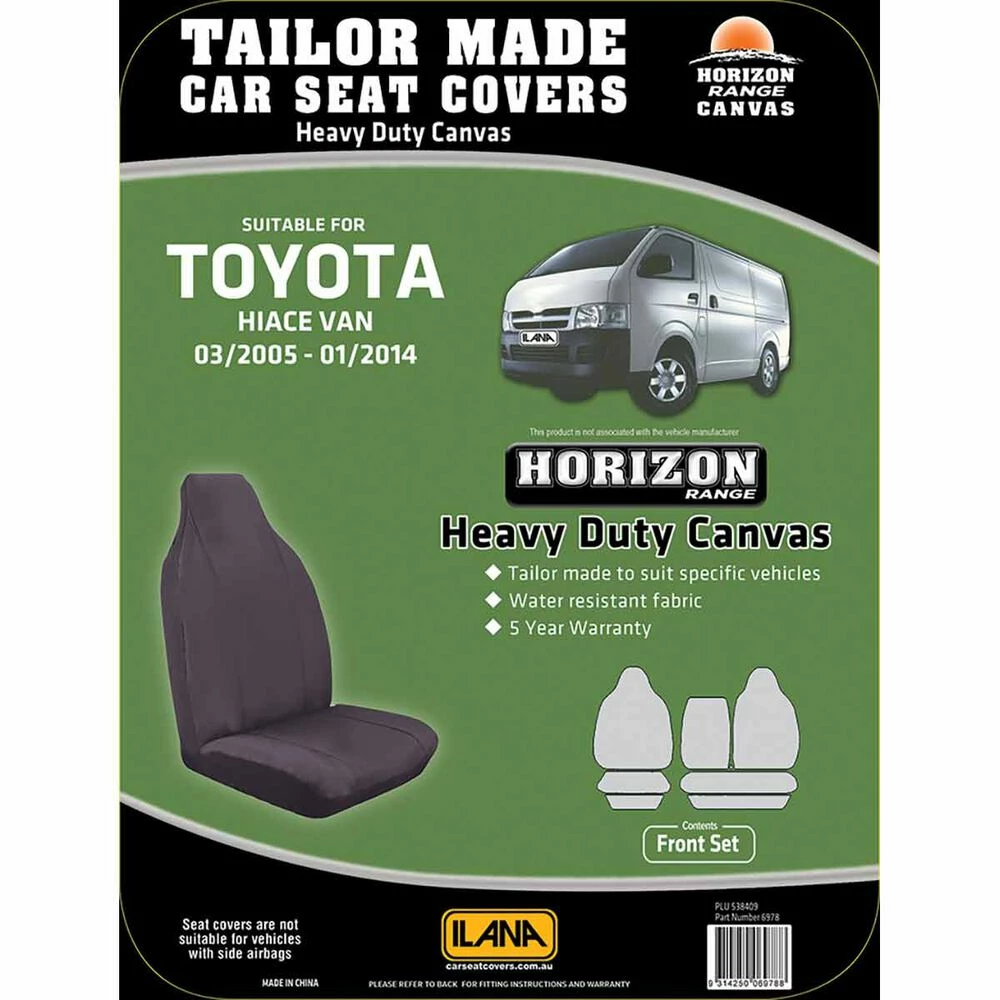 - A single row of tailor made front seat covers to suit Toyota HiAce LWB Van, 03/2005 to 01/2014