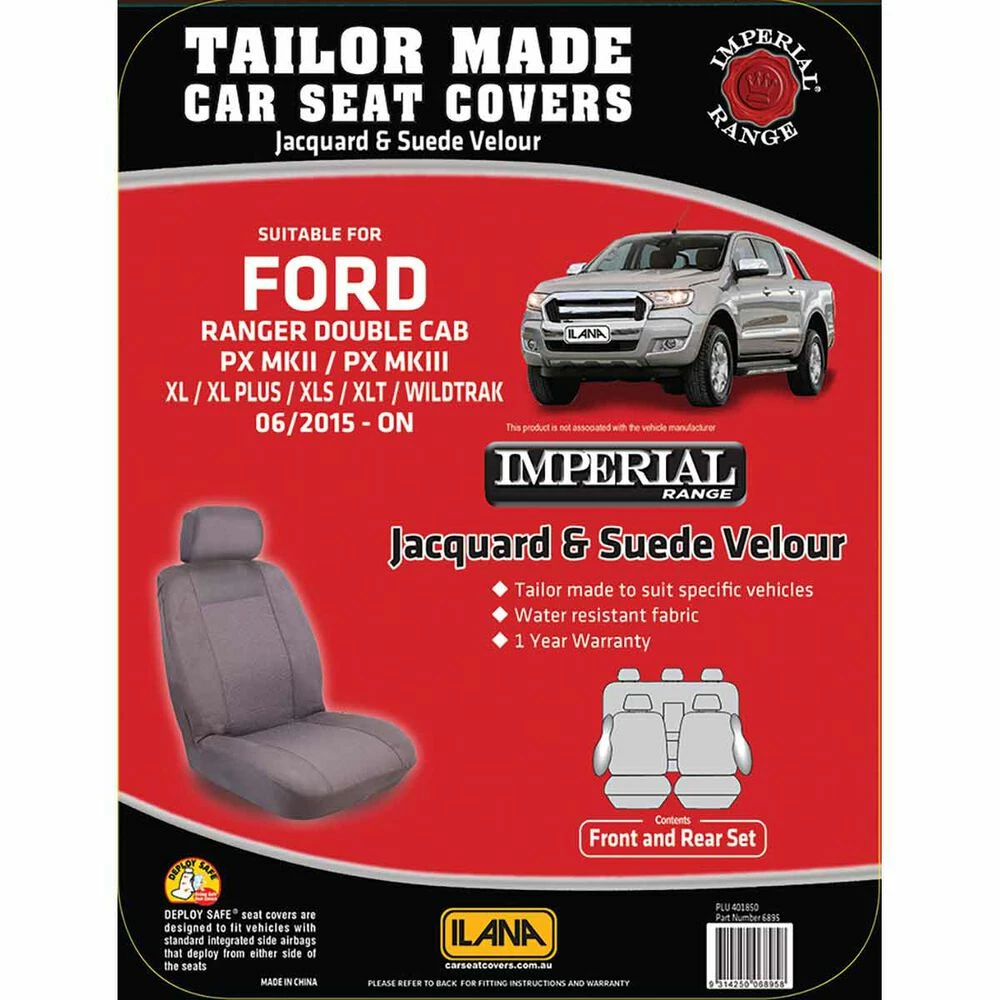 - A full two row set of tailor made front and rear seat covers to suit Ford Ranger Double Cab PX Mk II, XL, XL+, XLS and XLT 06/2015 onwards