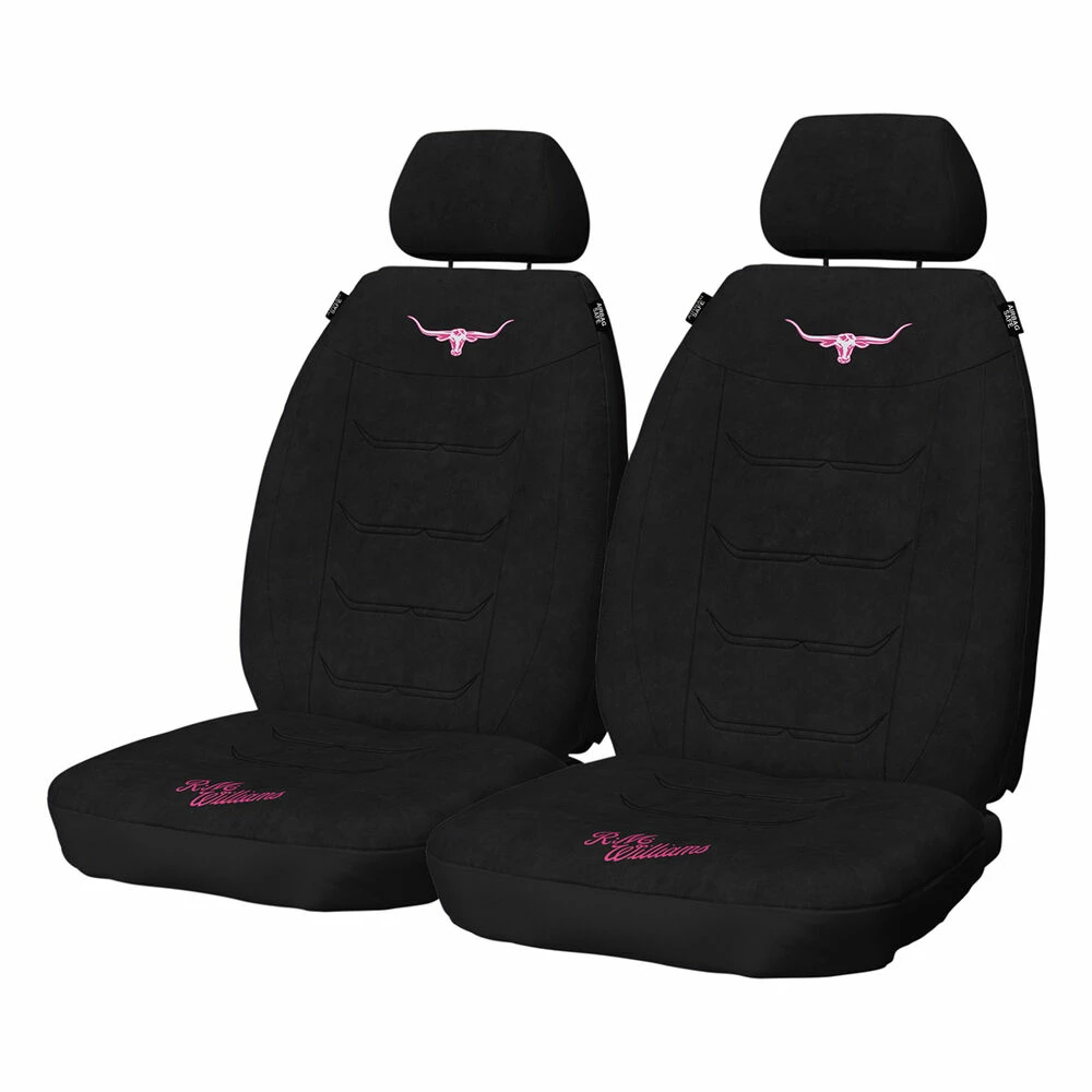 Spruce up your car interior in comfort and style with a set of R.M.Williams Jillaroo Suede Velour Seat Covers. The iconic Longhorn and logo embroidery in Jillaroo Pink make these covers stand out from the crowd, with a soft and luxurious suede velour material that makes for an ultra comfortable journey. Thick foam backing ensures that the seats underneath remain neat and tidy for the long run, with high quality construction and a 2 year warranty. Installation is simple thanks to the adjustable buckle system – no loops or tying required. A large sized map pocket on the rear of these seat covers makes for handy storage for those in the back seat as well.