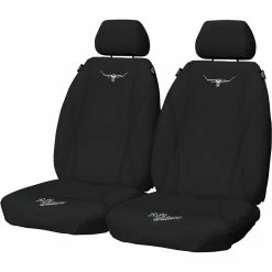 Spruce up your car interior in comfort and style with a set of R.M.Williams Neoprene Seat Covers. The iconic Longhorn and logo in white make these covers stand out from the crowd. Made with strong, waterproof and wear resistant neoprene material these seat covers will keep your seats protected, ideal for those off-road adventures. Installation is simple thanks to the adjustable buckle system – no loops or tying required. A large sized map pocket on the rear of these seat covers makes for handy storage for those in the back seat as well.