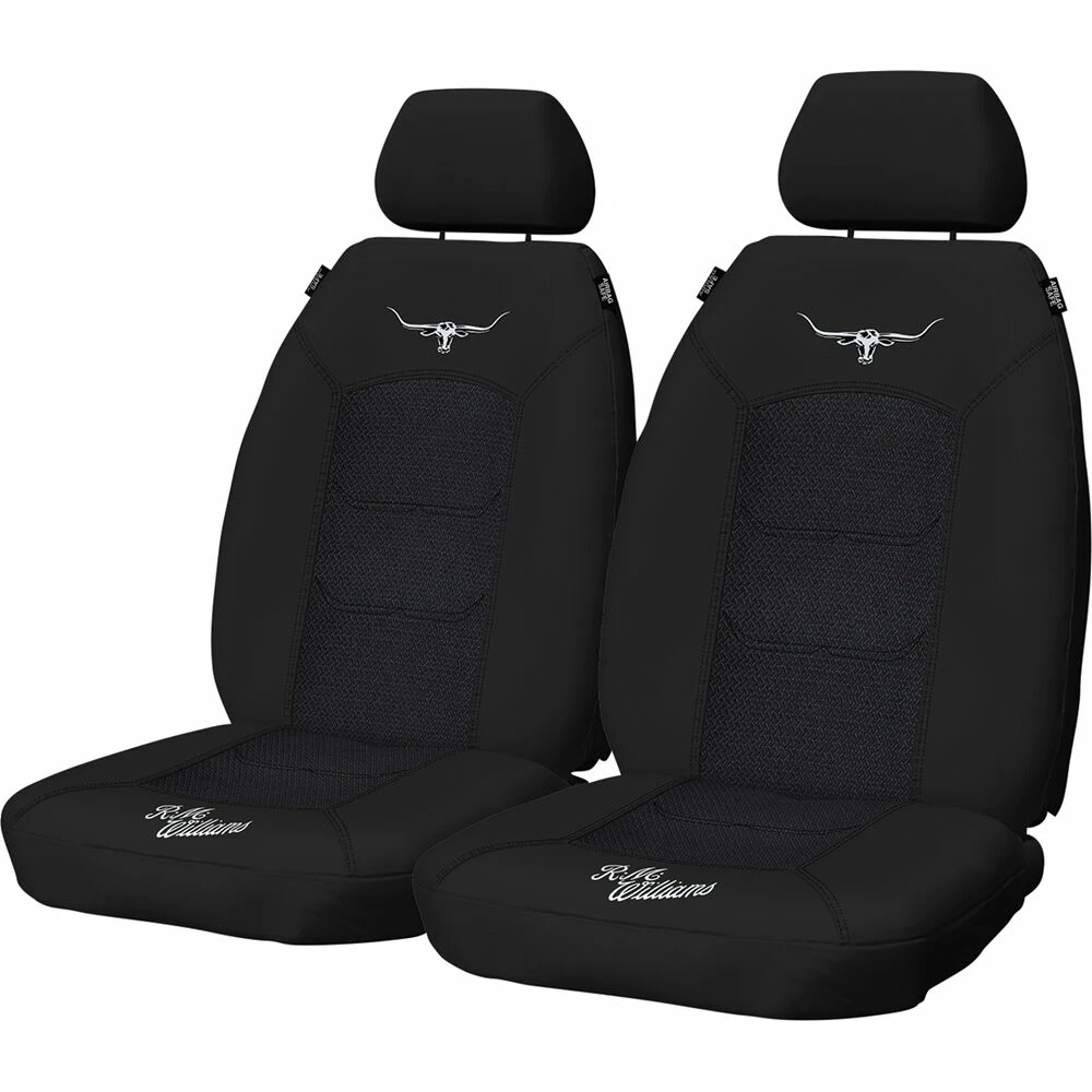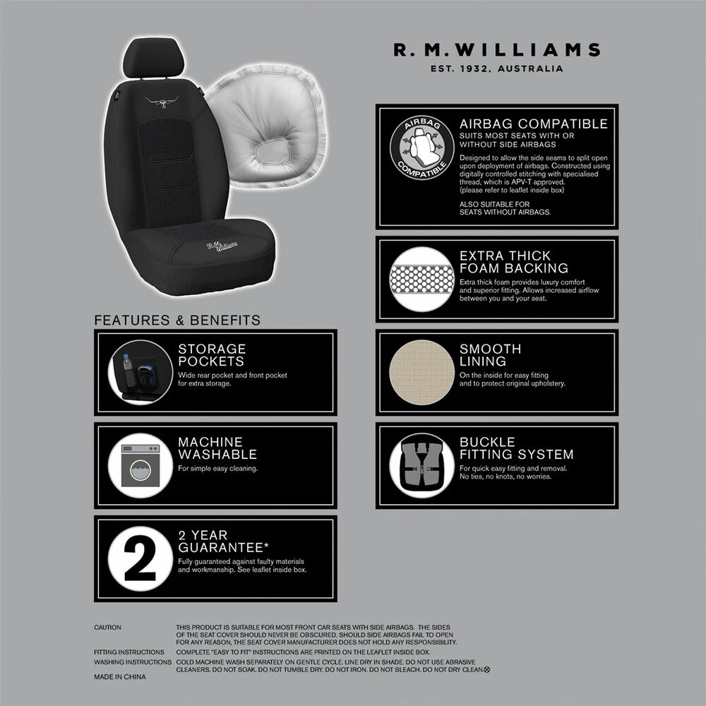 Spruce up your car interior in comfort and style with a set of R.M.Williams Seat Covers. Made with strong, water and wear resistant materials, these seat covers will keep your seats protected, ideal for those off-road adventures. Available in either high quality woven jacquard or suede velour, these covers are perfect for long lasting protection.