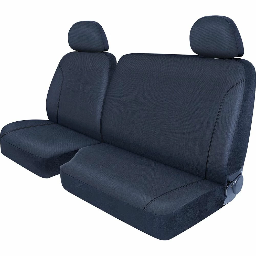 - A single seat cover suitable for a front bench seat with adjustable headrests and a tunnel cut out